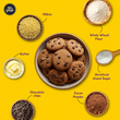 Millet Chocochip Cookies: Whole wheat atta, unrefined khand sugar, rice bran oil, butter, jowar flour, chocolate chips, cocoa powder, milk powder, baking powder, soy lecithin, salt
