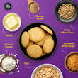 Oat Sesame Coconut Cookies: Whole wheat flour, unrefined khand sugar, coconut powder, rice bran oil, butter, oats flour, sesame seeds, milk powder, salt, baking powder, soy lecithin