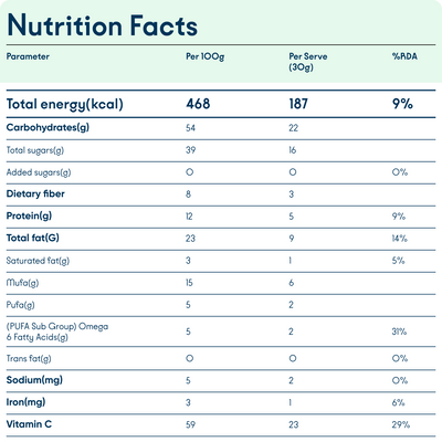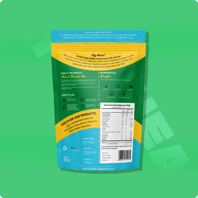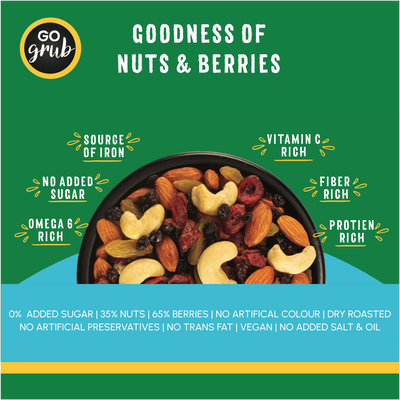 This delightful mix will ensure that you are charged up for 2-3 hours with good energy levels coming from healthy fats and fibre and antioxidants. Enjoy the flavour burst of tangy and sweet berries and raisins with natural sugars without any added sugar.It is designed to be consumed at all times of the day whenever you are feeling low on energy.
