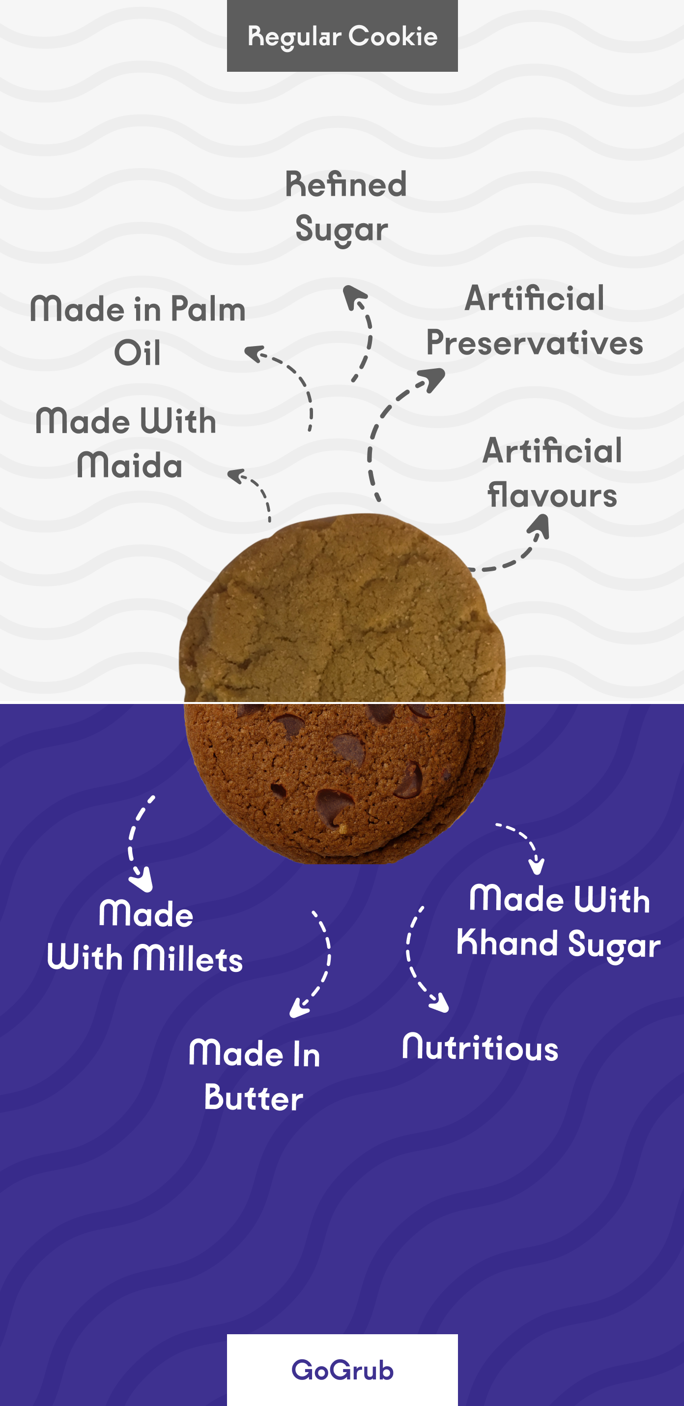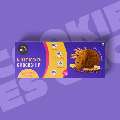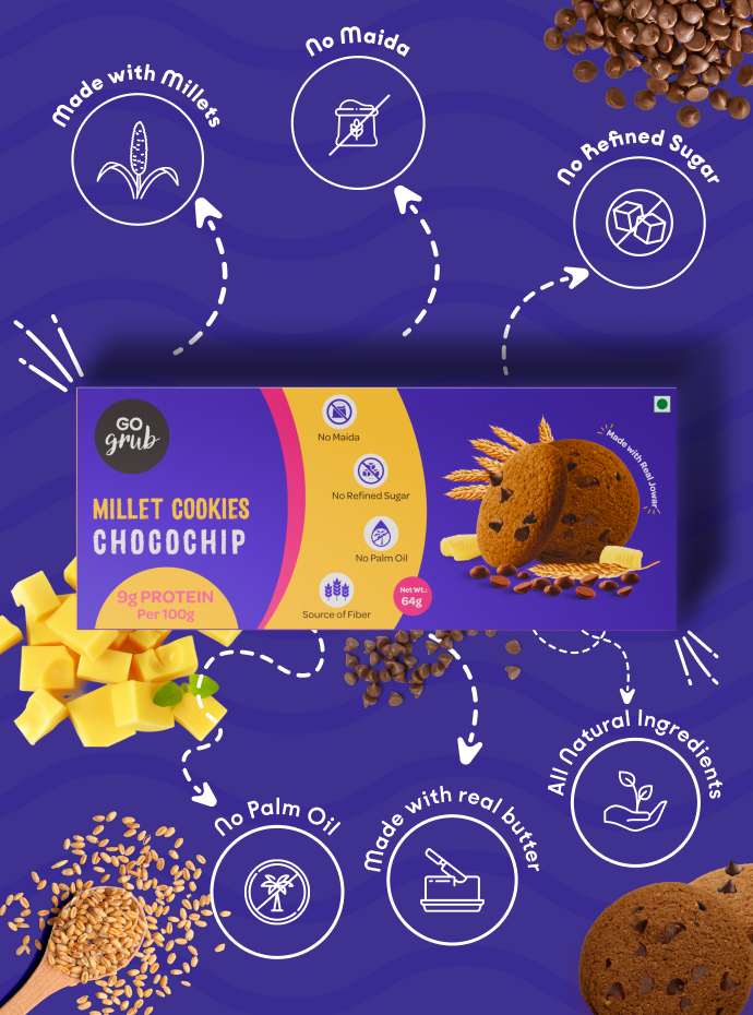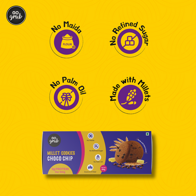 Our Millet Chocochip Cookies are made with millets and whole wheat flour — no maida, no refined sugar, no palm oil. Just real butter, rich chocochips, and that perfect crunchy-outside, soft-inside bite.
